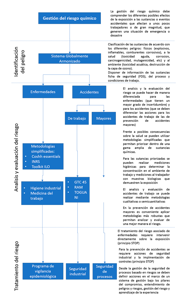 La gestión de riesgo químico debe abordarse desde el enfoque de peligro y riesgo. Cuando se refiere a sustancias químicas, el peligro está dado por las características intrínsecas de la sustancia y los riesgos se originan según la condición de uso de las mismas. Con el apoyo de Cisproquim, presentamos un esquema general para orientar la gestión del riesgo químico en tu organización: