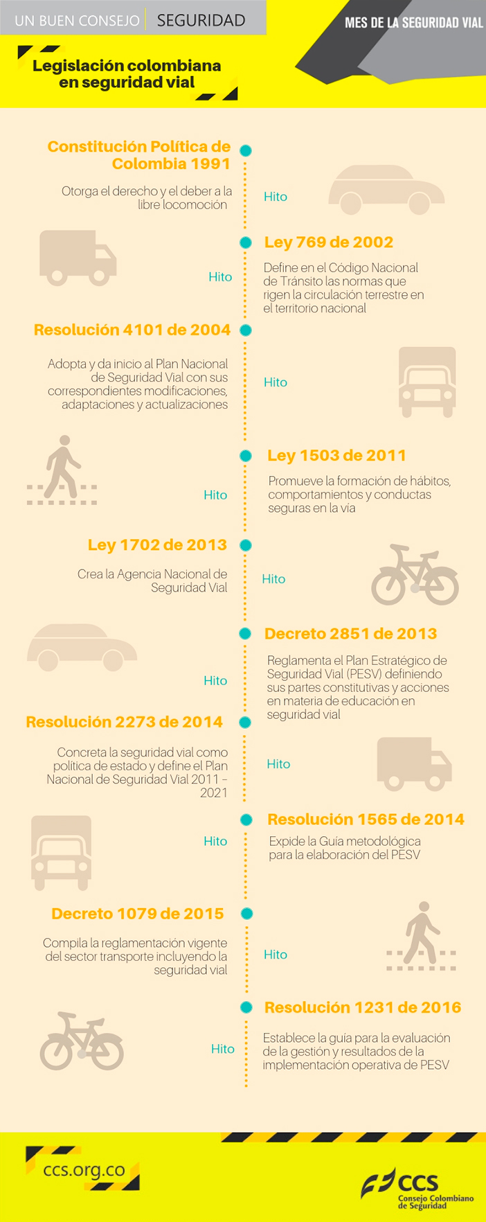 Existe un sinnúmero de documentos legislativos relacionados con el transporte y la seguridad vial en Colombia, sin embargo, la columna vertebral propuesta por el Estado para el desarrollo de las actividades propias en la materia se basa en la siguiente línea de tiempo: