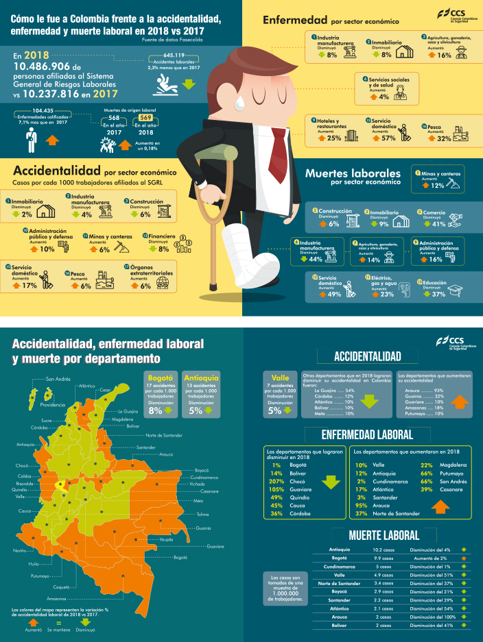 Según datos de la Federación de Aseguradores Colombianos (Fasecolda), en 2018 se presentaron 645.119 accidentes laborales con una disminución de 2,3% frente al año anterior; por su parte las enfermedades calificadas tuvieron un aumento de 7,1% con un total de 104.435 casos. Con respecto a la mortalidad, aunque no hubo un aumento significativo para 2018, se presentaron 569 muertes de origen laboral.