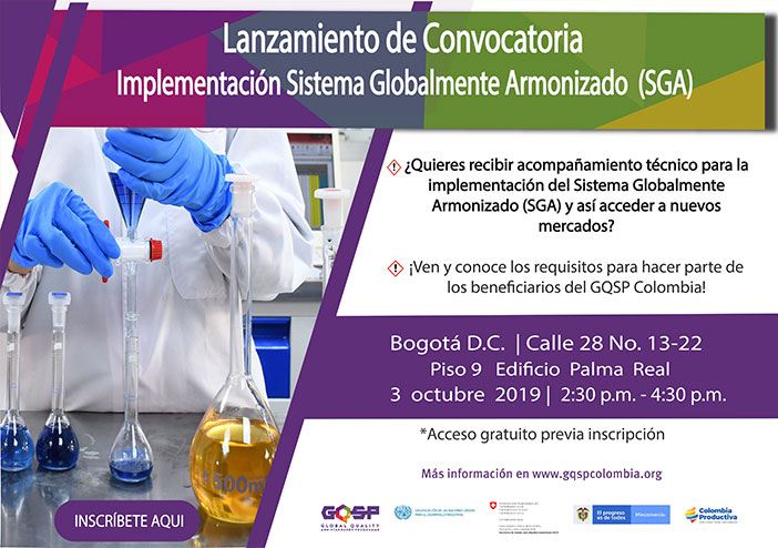 Por tal motivo, el Programa de Calidad para la Cadena de Químicos - GQSP Colombia, proyecto de asistencia técnica ejecutado por ONUDI (Organización de Naciones Unidas para el Desarrollo industrial), con el apoyo de la Secretaría de Estado para Asuntos Económicos de Suiza (SECO), del Ministerio de Comercio, Industria y Turismo (MinComercio) y Colombia Productiva, tienen el gusto de invitarlo al “Lanzamiento de la convocatoria de acompañamiento técnico para la implementación del Sistema Globalmente Armonizado (SGA) en Mipymes”, que se realizará el próximo 3 de Octubre de 2019, en la ciudad de Bogotá D.C., en la Calle 28 # 13-22 Piso 9, Edificio Palma Real de 2:30 a 4:30 p.m.