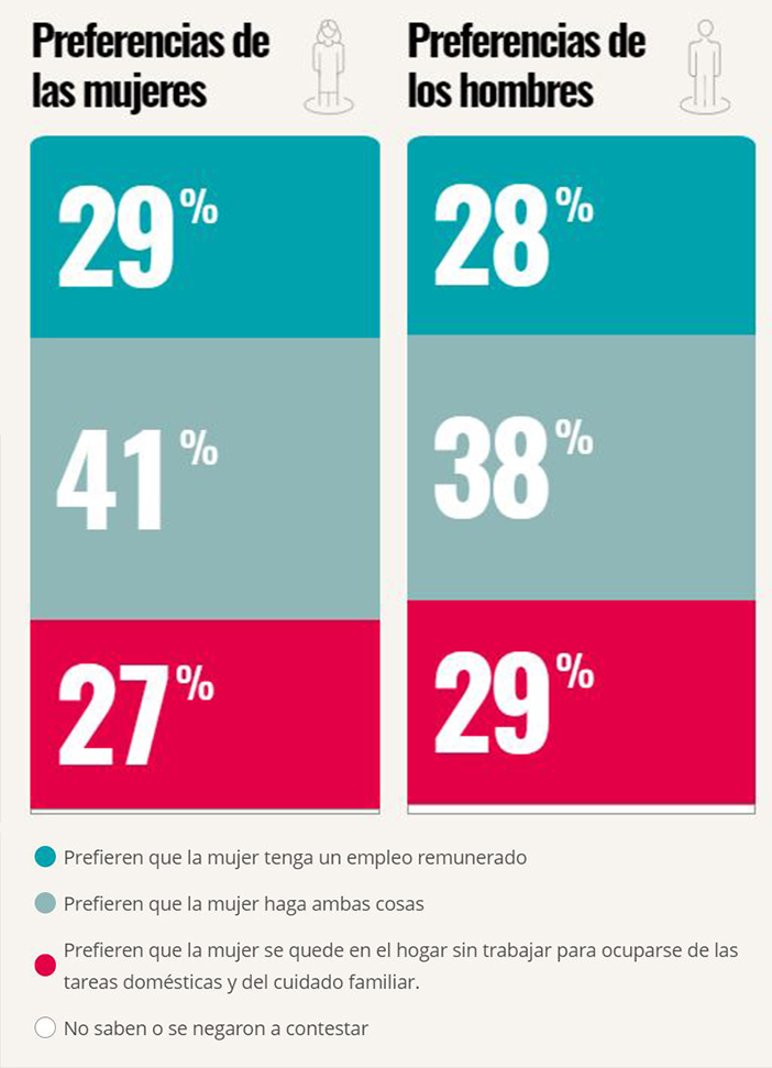 - El 70% de las mujeres y el 66% de los hombres encuestados prefieren que la mujer tenga un empleo remunerado, más del doble que el porcentaje de personas que prefieren que la mujer se quede en el hogar sin trabajar.